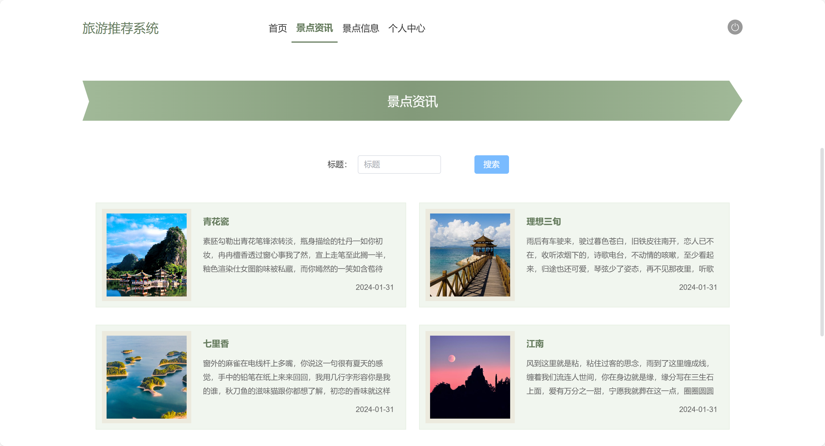 [J0055]基于SpringBoot+Vue的旅游推荐系统 ├─ result_image.png ├─ 更多教程.url ├─ 演示视频.mp4 ├─ 项目讲解 │ ├─ 代码修改(通用).url │ └─ 代码讲解(通用.url ├─ 部署 │ ├─ 运行部署(通用).url │ └─ 部署说明.txt ├─ 设计说明 │ └─ 数据库表结构文档.doc └─ 数据库脚本 └─ cl0147577.sql