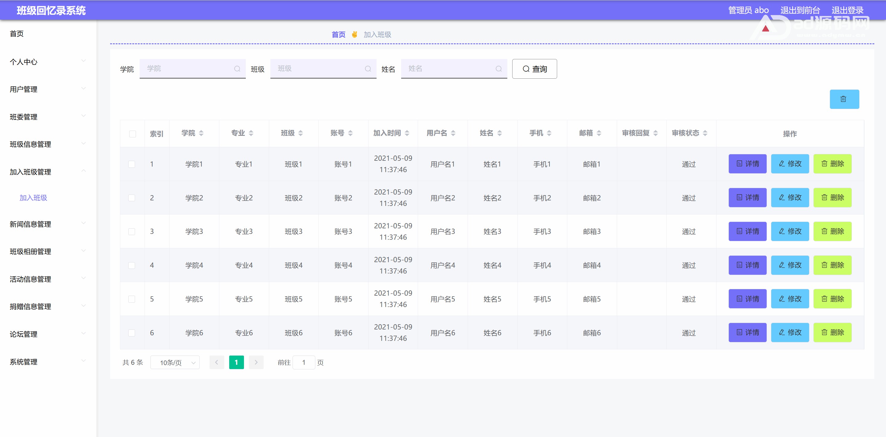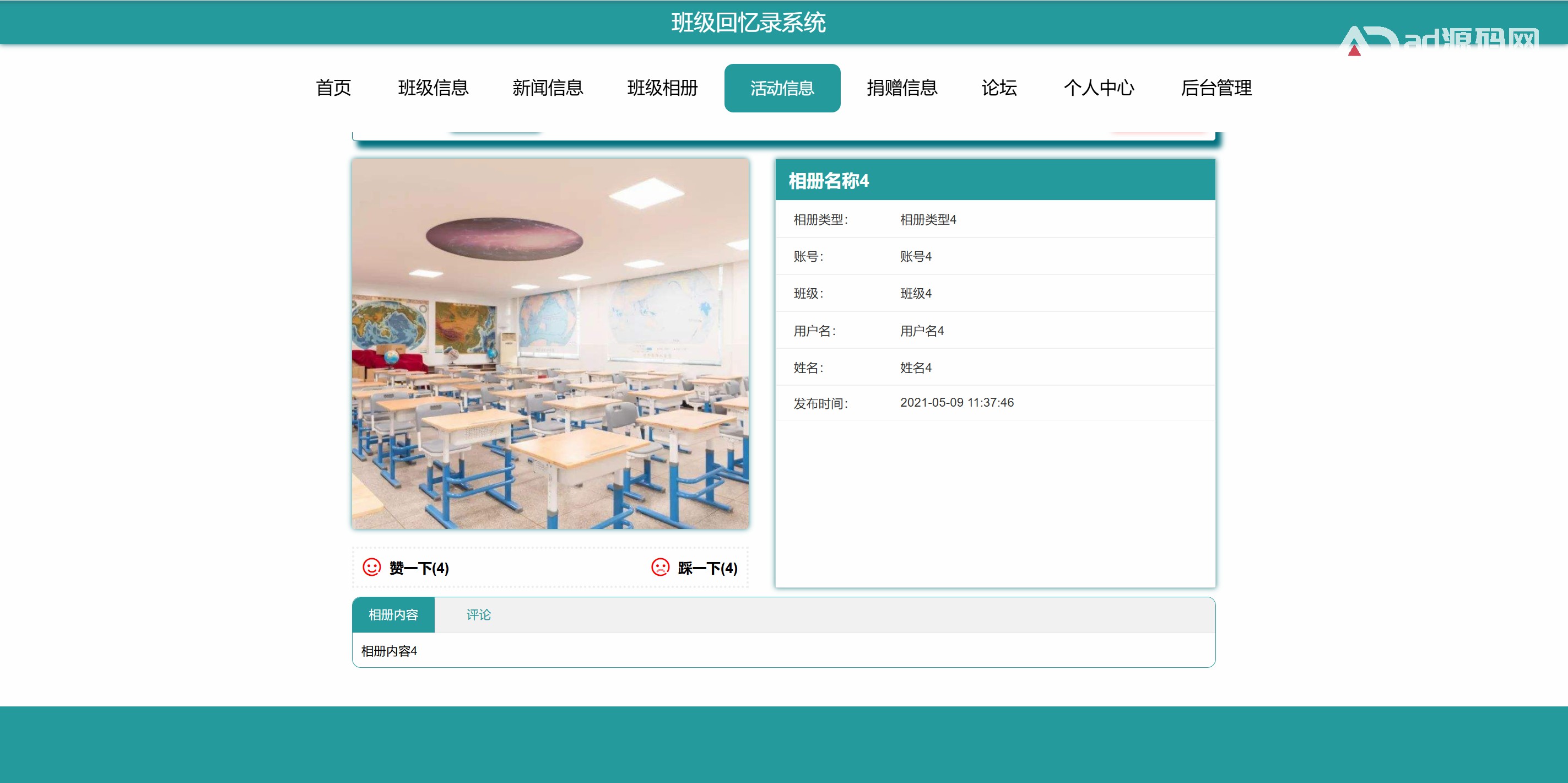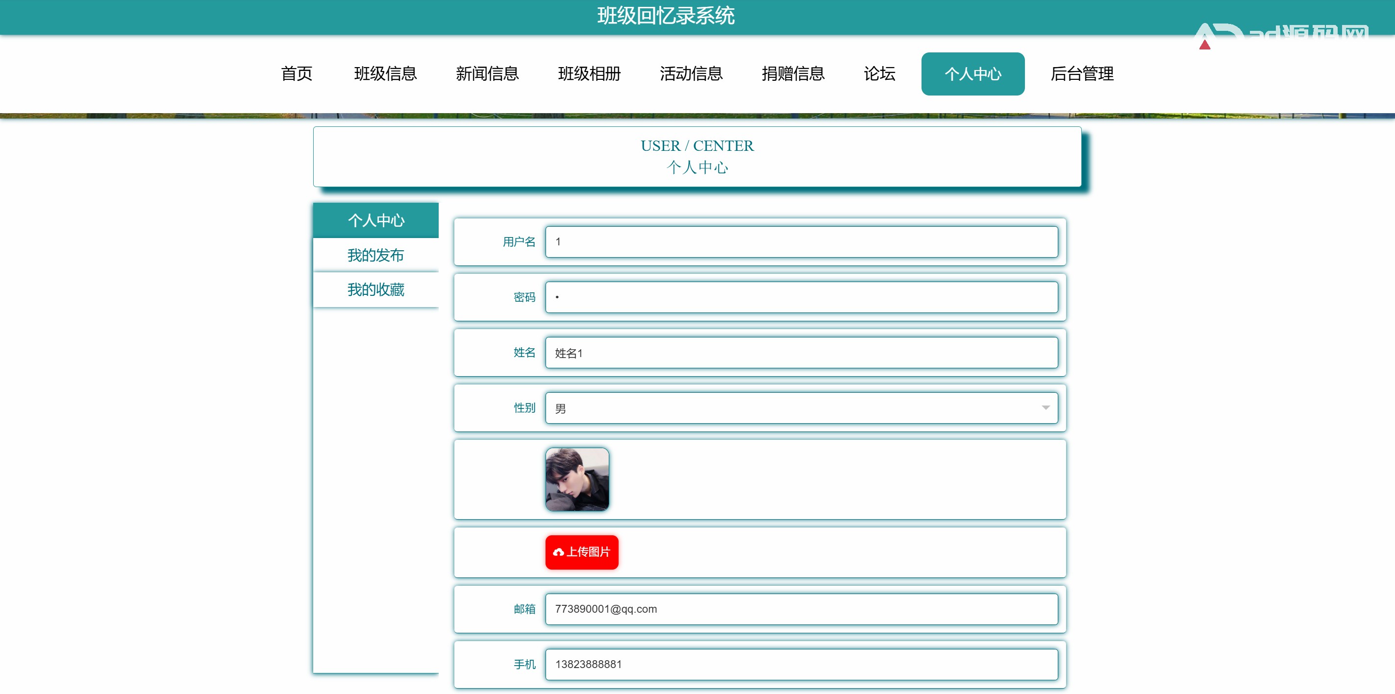 此系统基于SpringBoot框架开发,数据库mysql,前端使用Vue,前后台分离项目,拥有用户管理,班委管理,班级信息管理,加入班级管理,新闻信息管理,班级相册管理,活动信息管理,捐赠信息管理,论坛管理,系统管理。