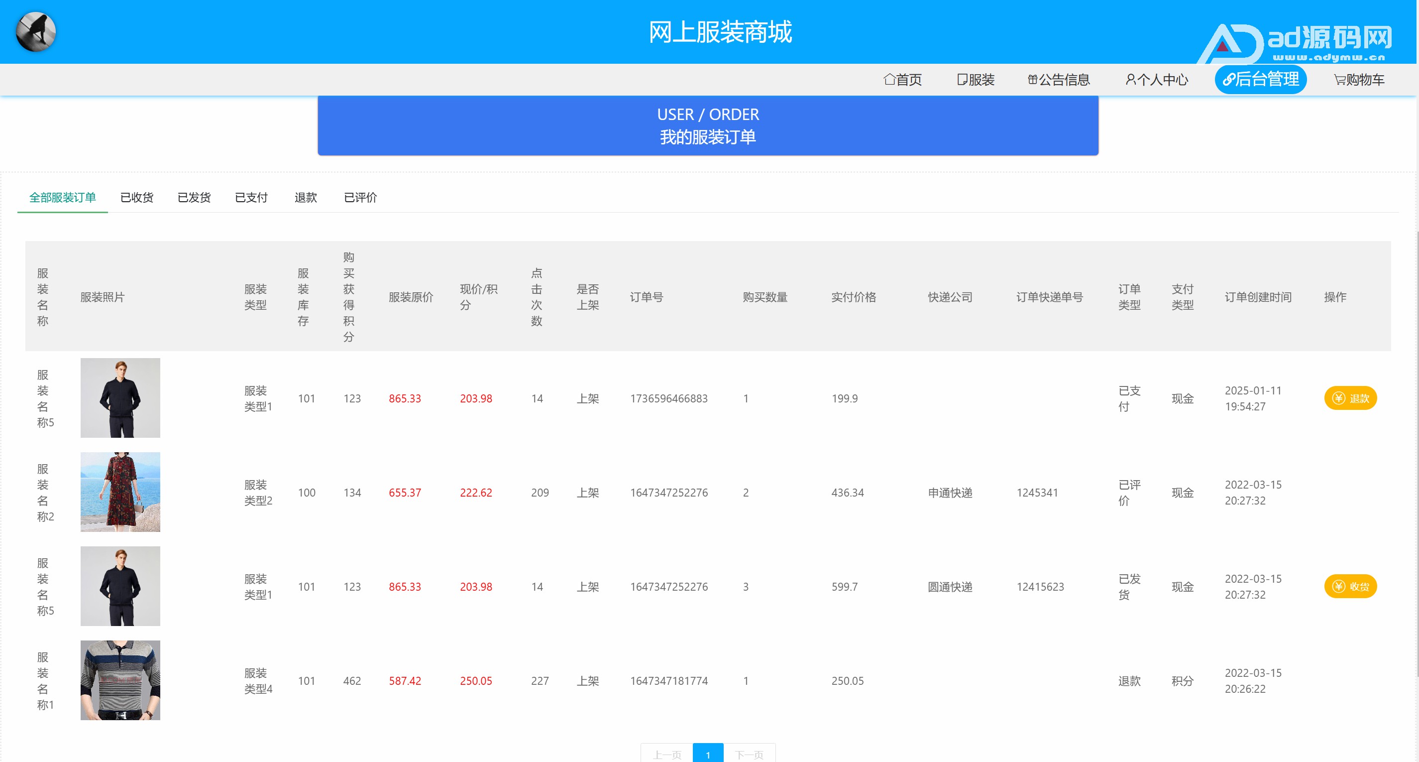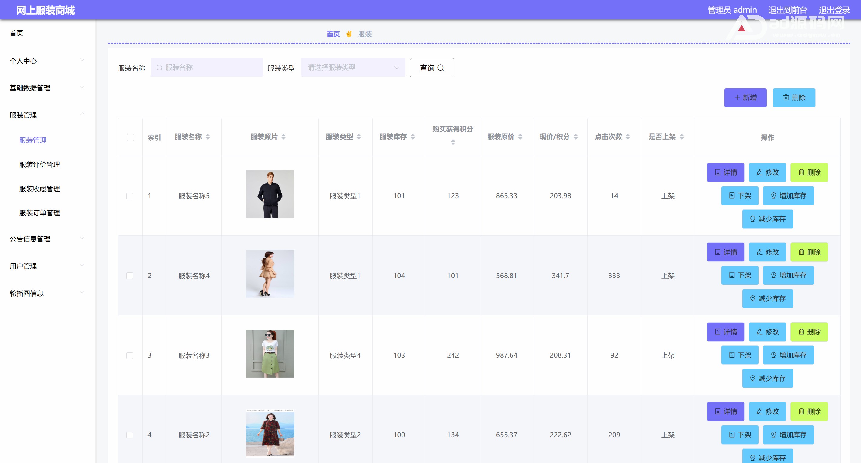 此系统基于SpringBoot框架开发,数据库mysql,前端使用Vue,前后台分离项目,拥有用户管理,服装管理,评价管理,服装收藏管理,订单管理,公告管理。