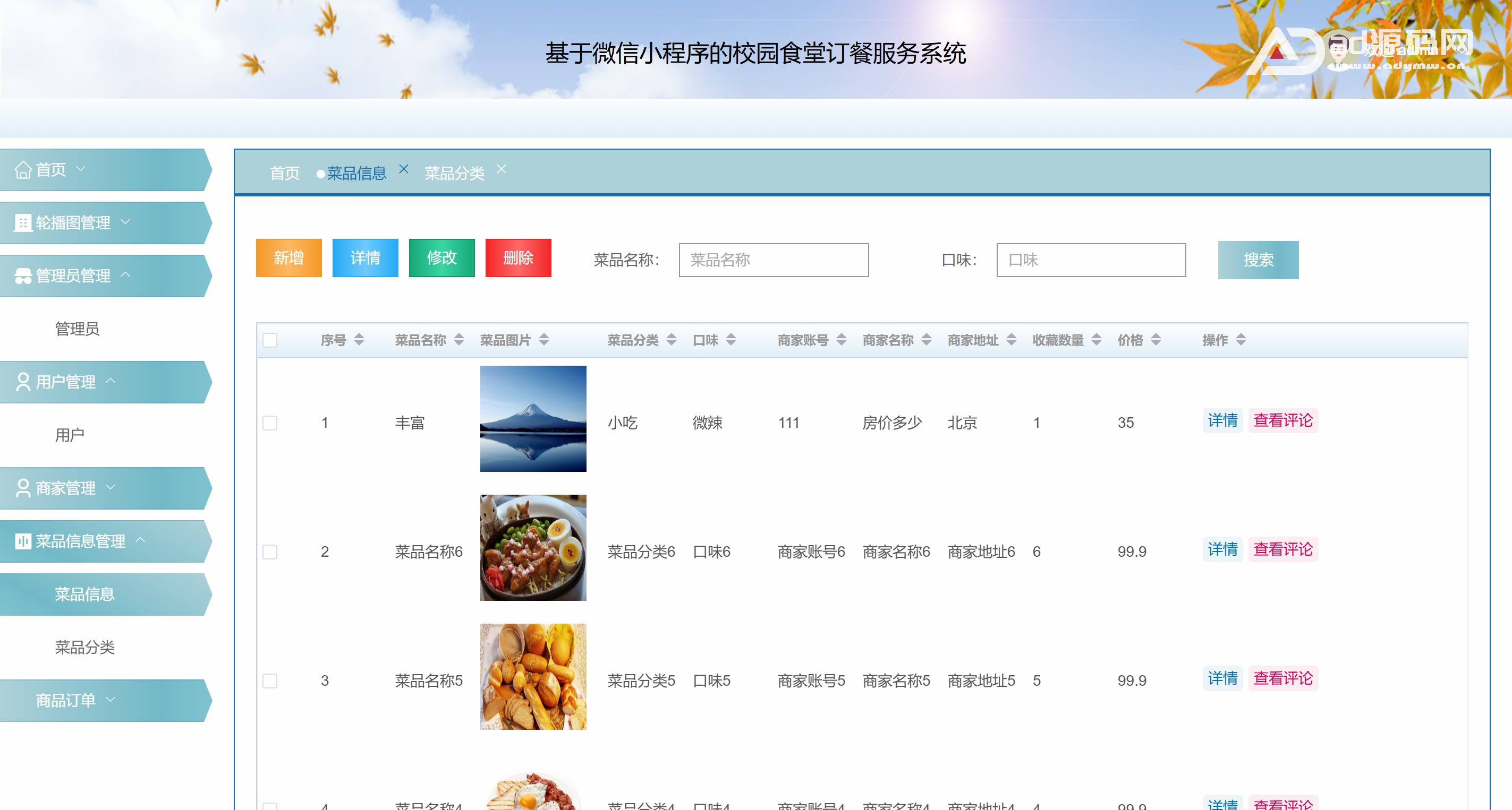 [W0004]基于微信小程序的校园订餐系统 ├─ result_image.png ├─ 更多教程.url ├─ 演示视频.mp4 ├─ 项目讲解 │ ├─ 代码修改(通用).url │ └─ 代码讲解(通用.url ├─ 部署 │ ├─ 运行部署(通用).url │ └─ 部署说明.txt ├─ 设计说明 │ └─ 数据库表结构文档.doc └─ 数据库脚本 └─ cl57111366.sql