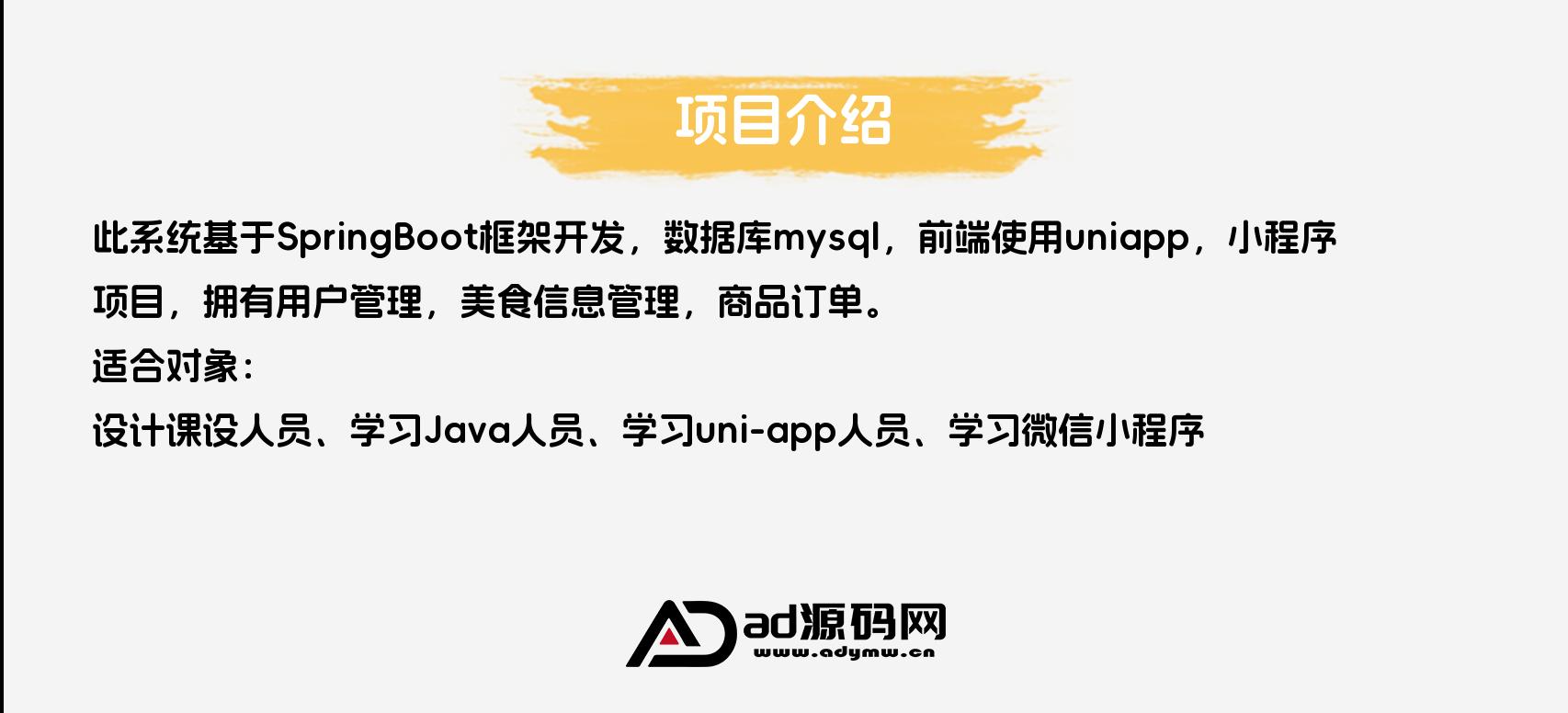 此系统基于SpringBoot框架开发,数据库mysql,前端使用uniapp,小程序项目,拥有用户管理,美食信息管理,商品订单。