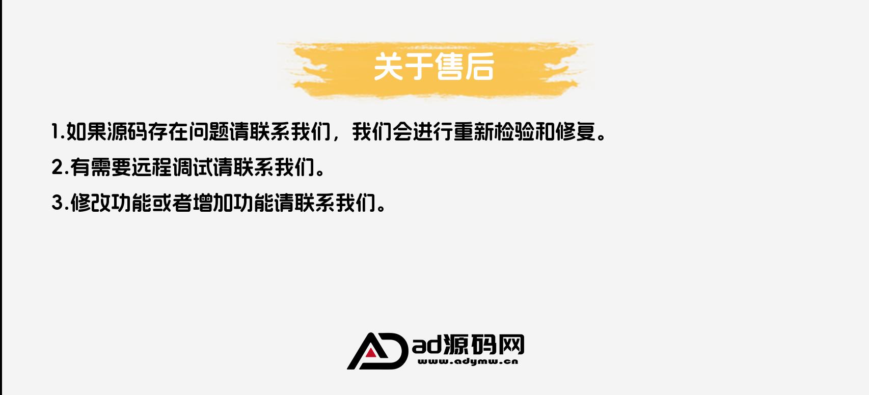 1.如果源码下载地址失效请 联系站长QQ进行补发。 2.本站所有资源仅用于学习及研究使用,请必须在24小时内删除所下载资源,切勿用于商业用途,否则由此引发的法律纠纷及连带责任本站和发布者概不承担。资源除标明原创外均来自网络整理,版权归原作者或本站特约原创作者所有,如侵犯到您权益请联系本站删除! 3.本站站内提供的所有可下载资源(软件等等)本站保证未做任何负面改动(不包含修复bug和完善功能等正面优化或二次开发);但本网站不能保证资源的准确性、安全性和完整性,用户下载后自行斟酌,我们以交流学习为目的,并不是所有的源码都100%无错或无bug;同时本站用户必须明白,【ad源码网】对提供下载的软件等不拥有任何权利(本站原创和特约原创作者除外),其版权归该资源的合法拥有者所有。 4.请您认真阅读上述内容,购买即以为着您同意上述内容。
