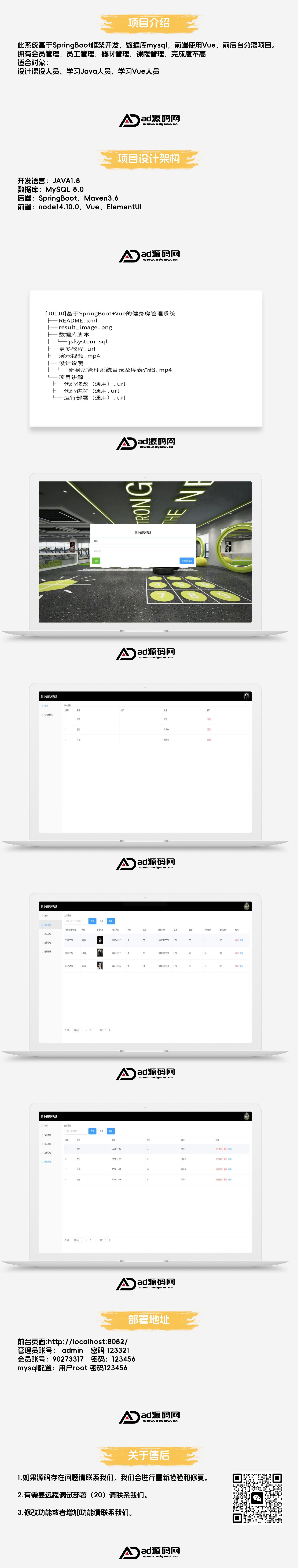 此系统基于SpringBoot框架开发,数据库mysql,前端使用Vue,前后台分离项目。 拥有会员管理,员工管理,器材管理,课程管理,完成度不高 适合对象: 设计课设人员、学习Java人员、学习Vue人员