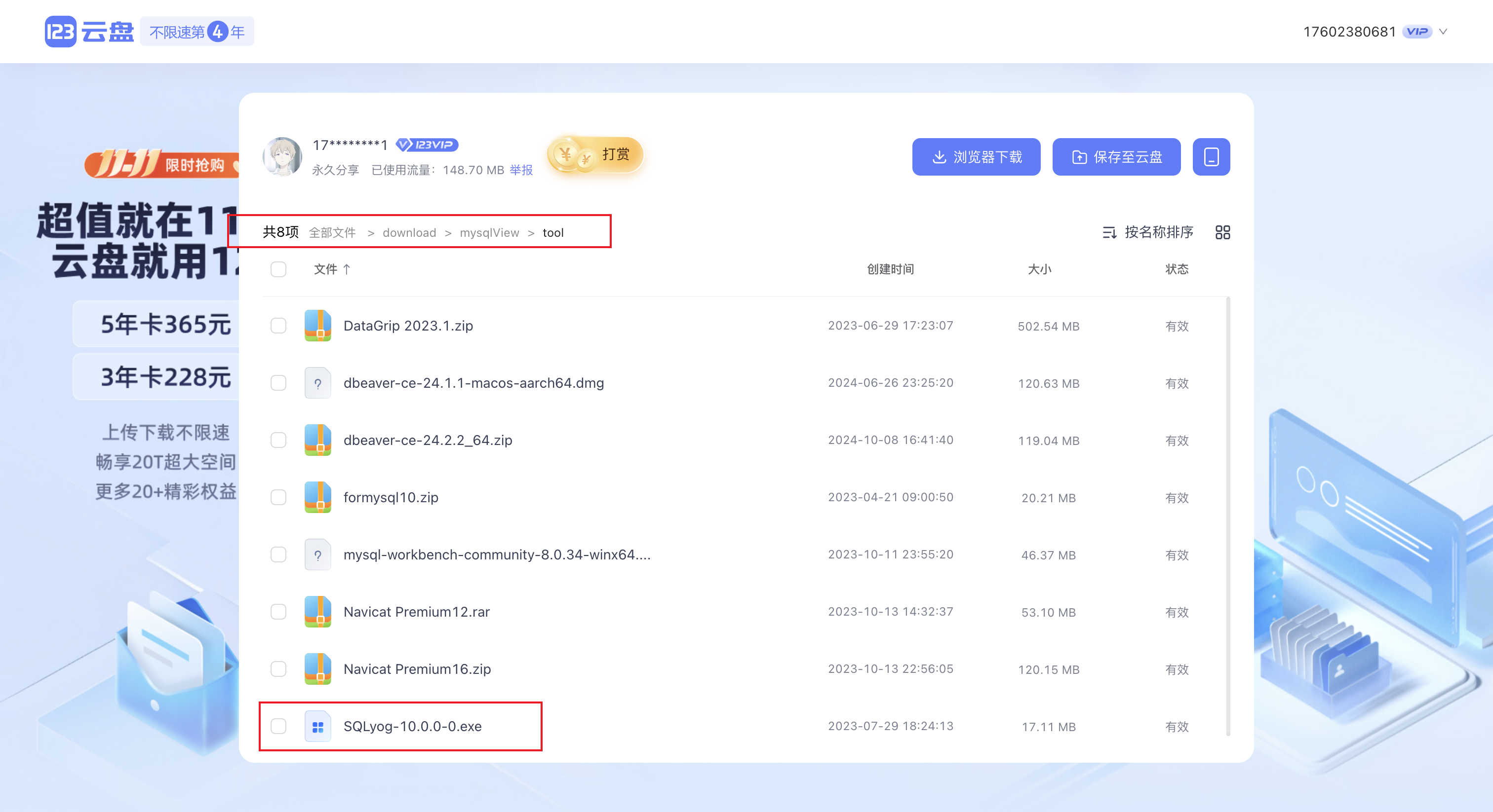 123云盘 渠道进入mysqlView/tool目录点击下载