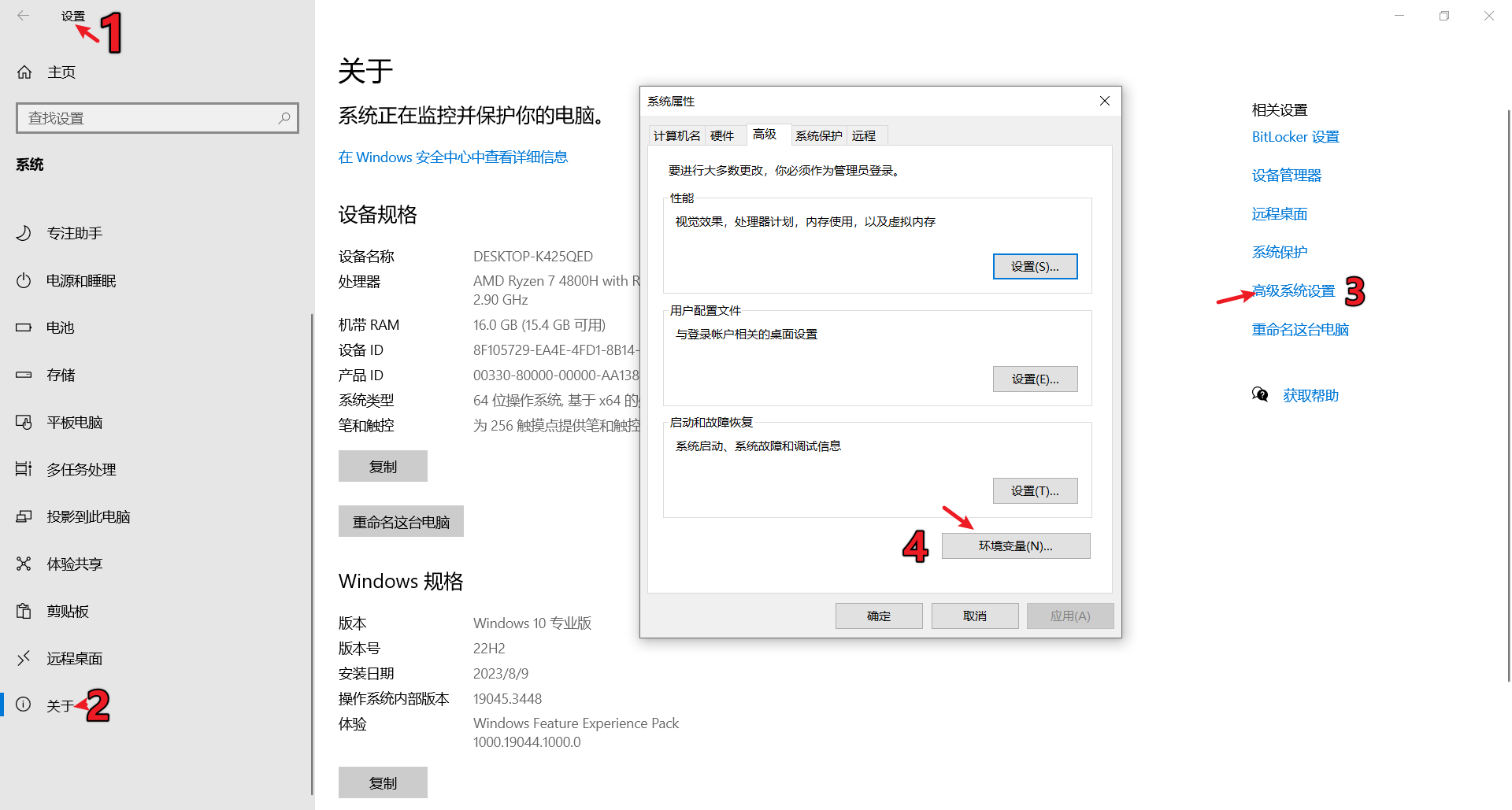 打开电脑的环境变量 => 操作步骤为 设置—关于—高级系统设置—环境变量
