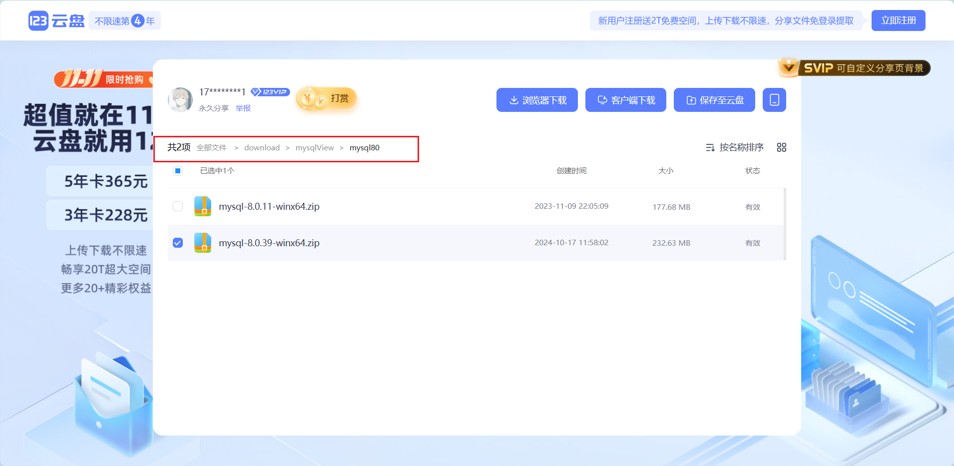 123云盘 渠道进入download/mysqlView/mysql80目录点击下载