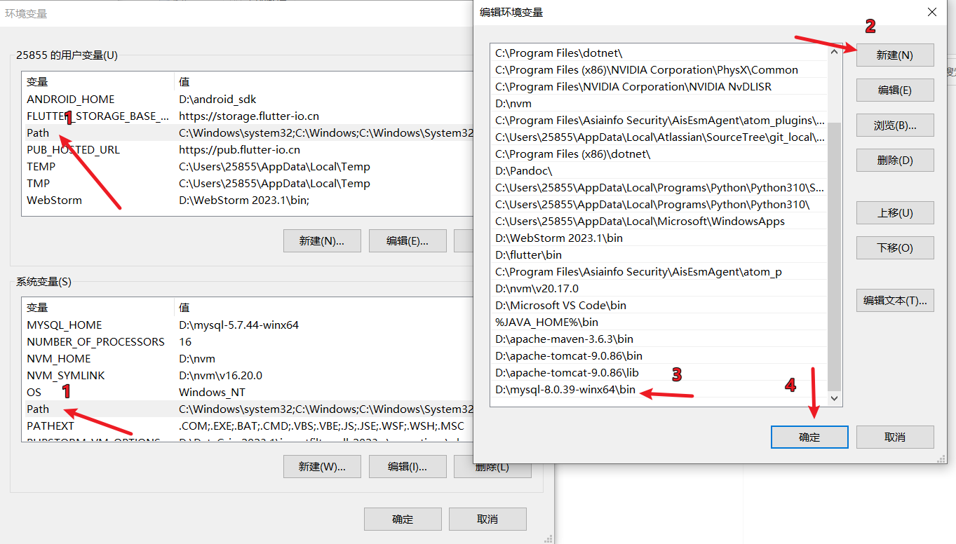 在用户变量和系统变量中找到Path 两个都需要配置 配置内容为你文件的路径后面+bin 并且只能存在一个mysql的环境变量