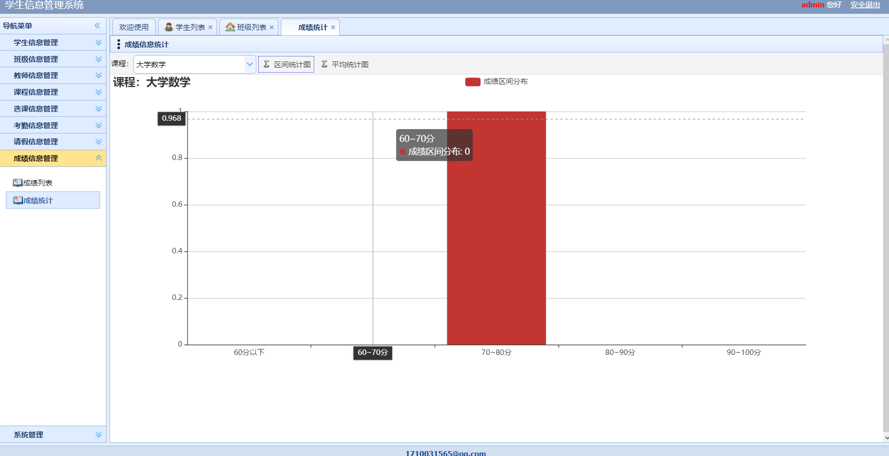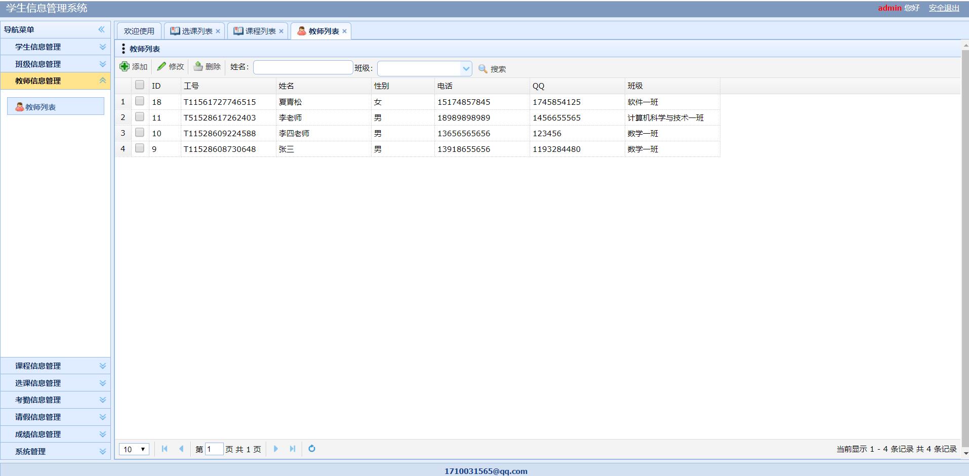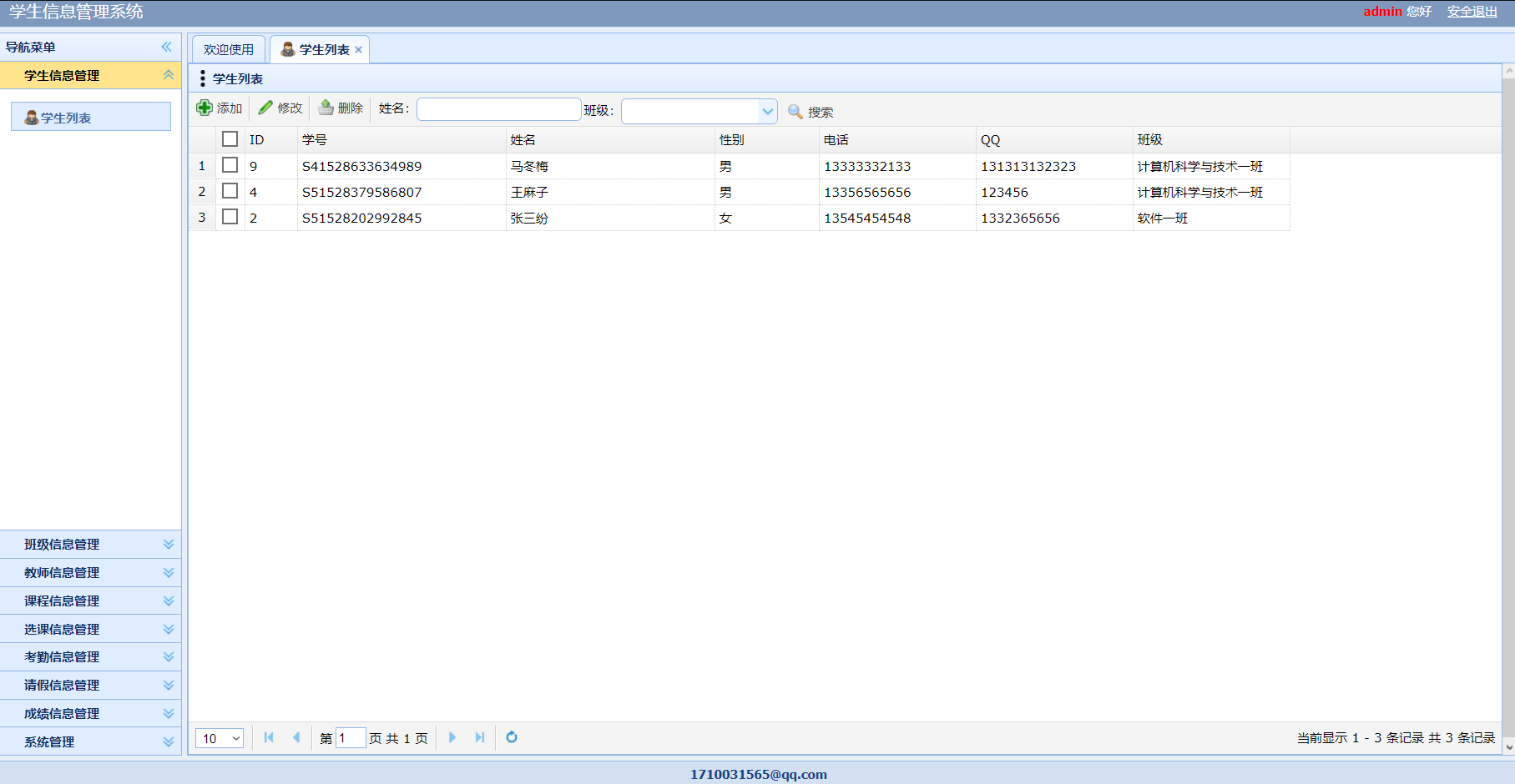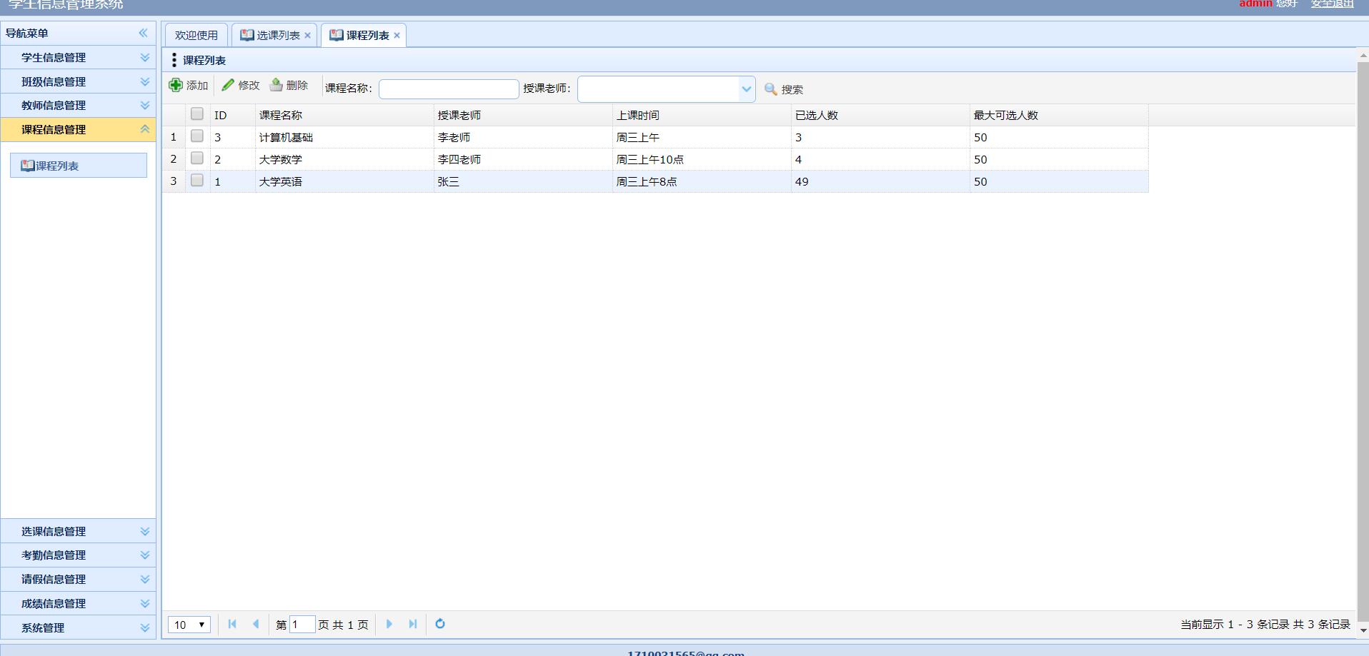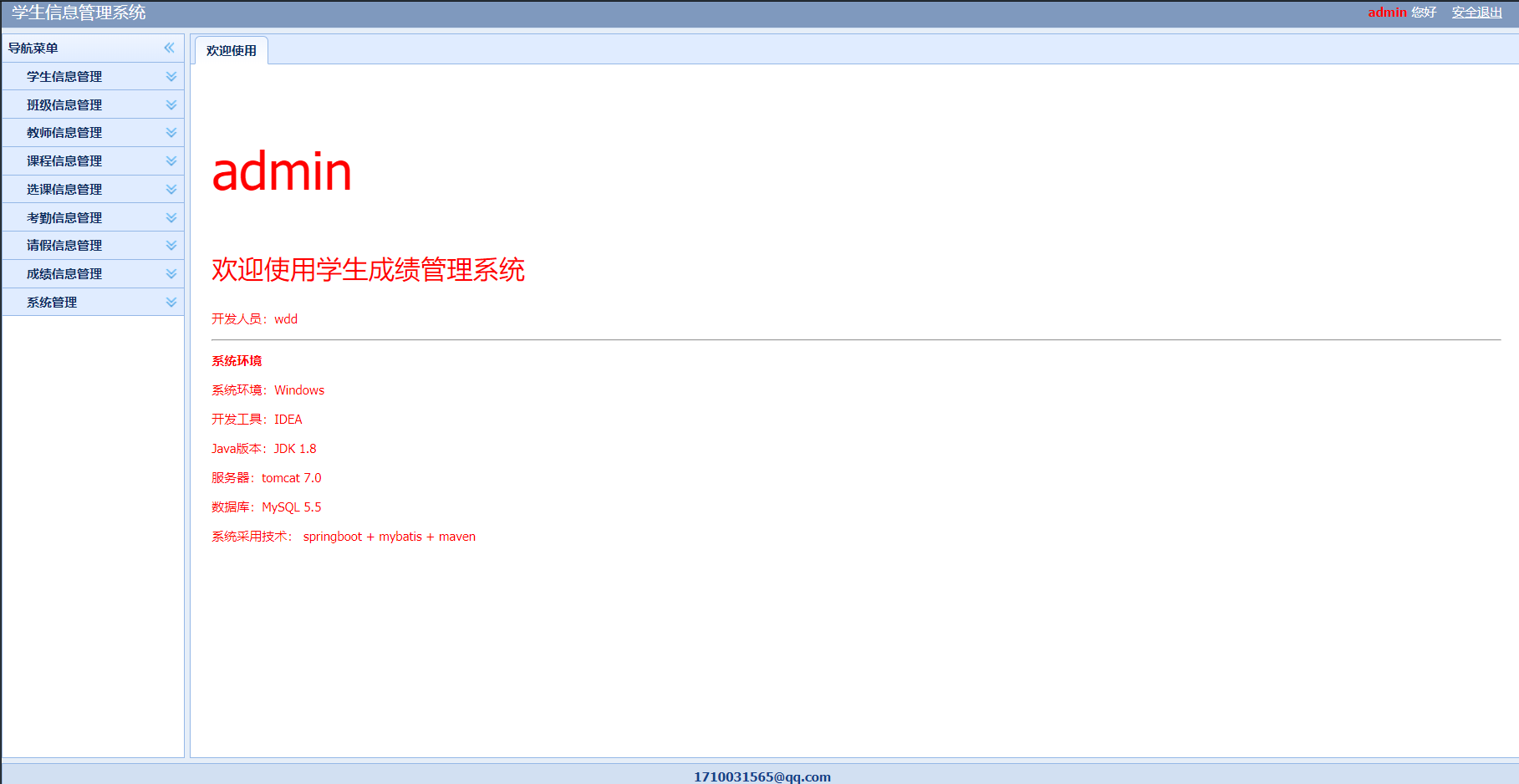此学生管理系统基于SpringBoot框架开发,数据库mysql,前端Jquery。系统角色分为学生和老师和管理员界面。学生登录可以查看自己的分数 签到 信息 请假,老师登录可以管理学生信息,审批请假,查看信息 管理员可以后台管理老师和学生。