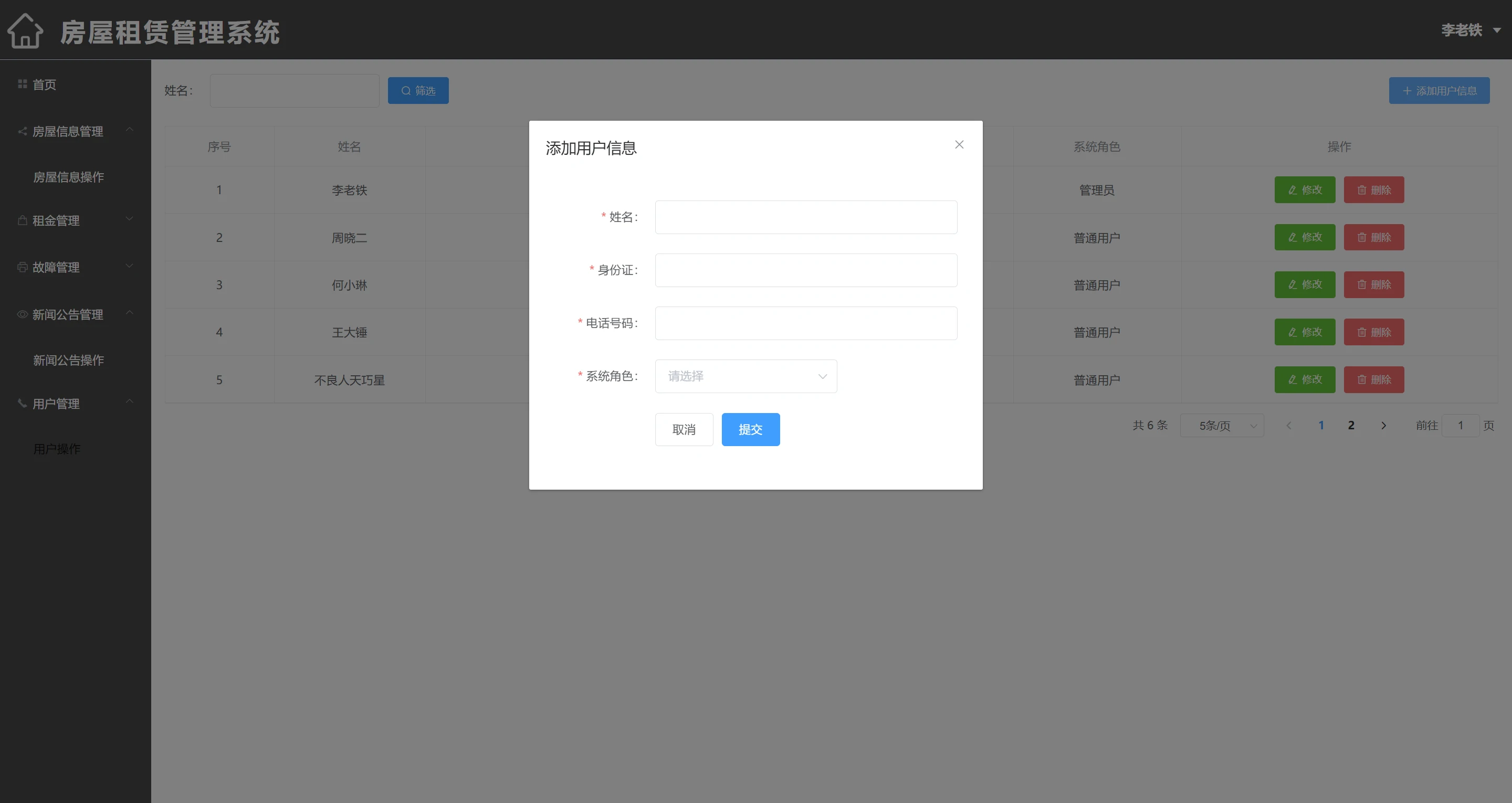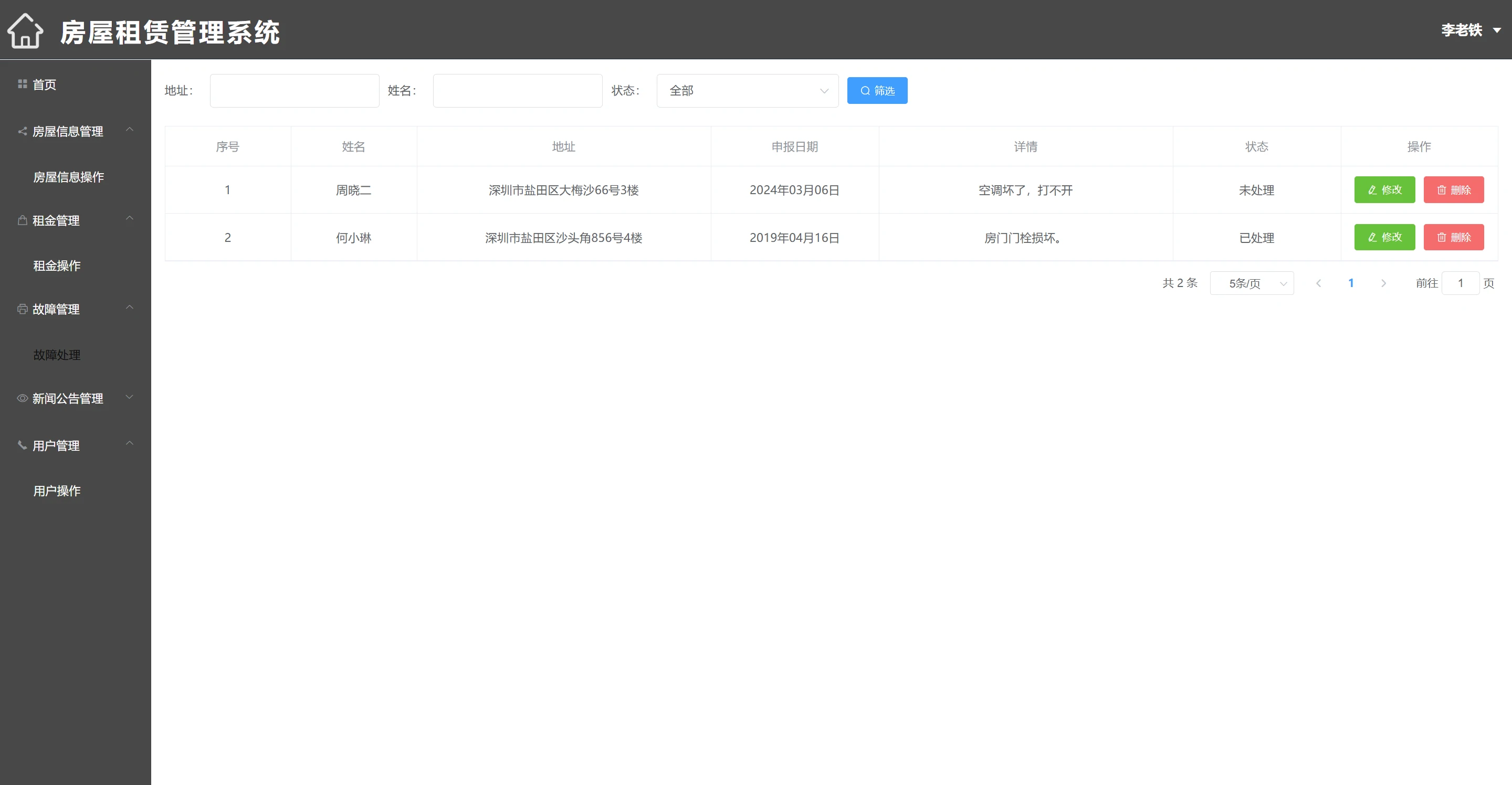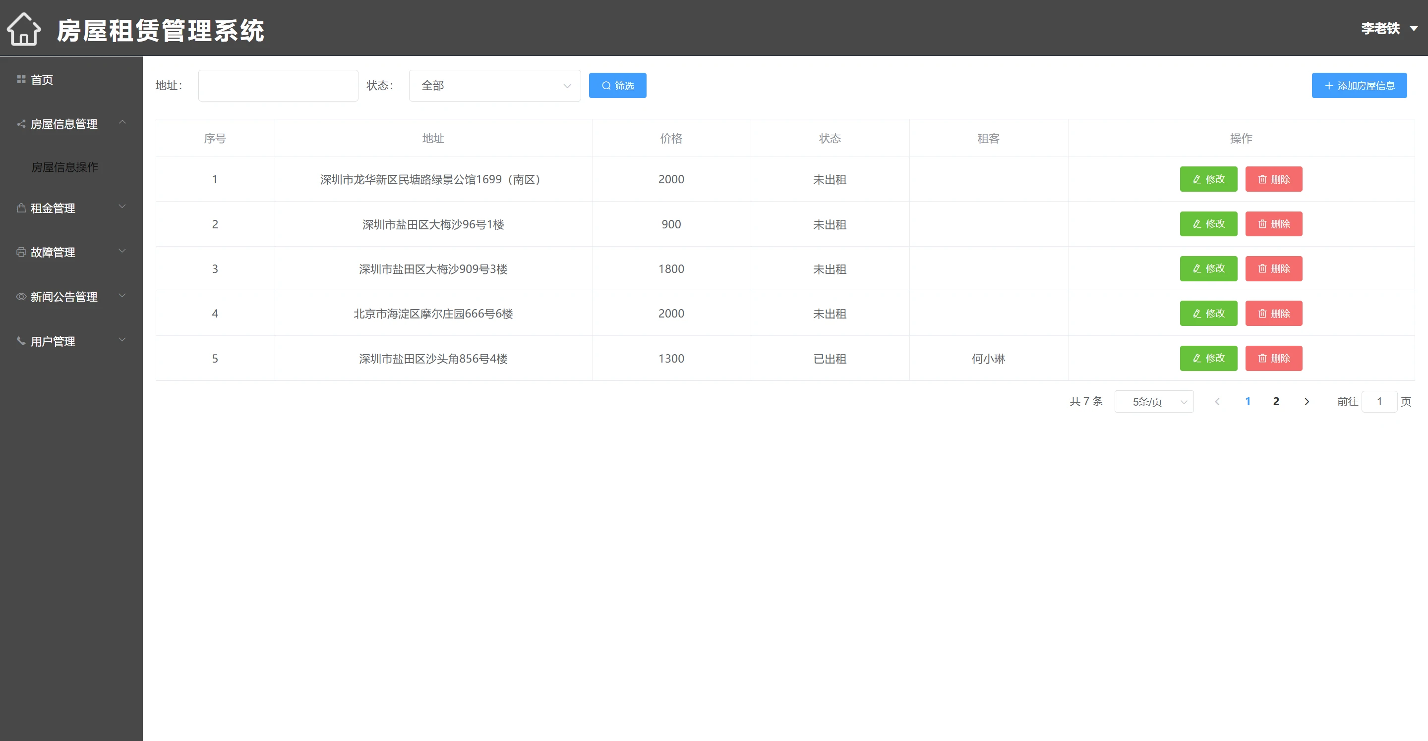 此房屋租赁系统基于SpringBoot框架开发,数据库mysql,前端使用Vue。拥有用户和管理员角色,并且前后台分离项目,拥有房屋信息管理模块,租金管理模块,故障管理模块,新闻公告管理模块,用户管理模块,登录模块。