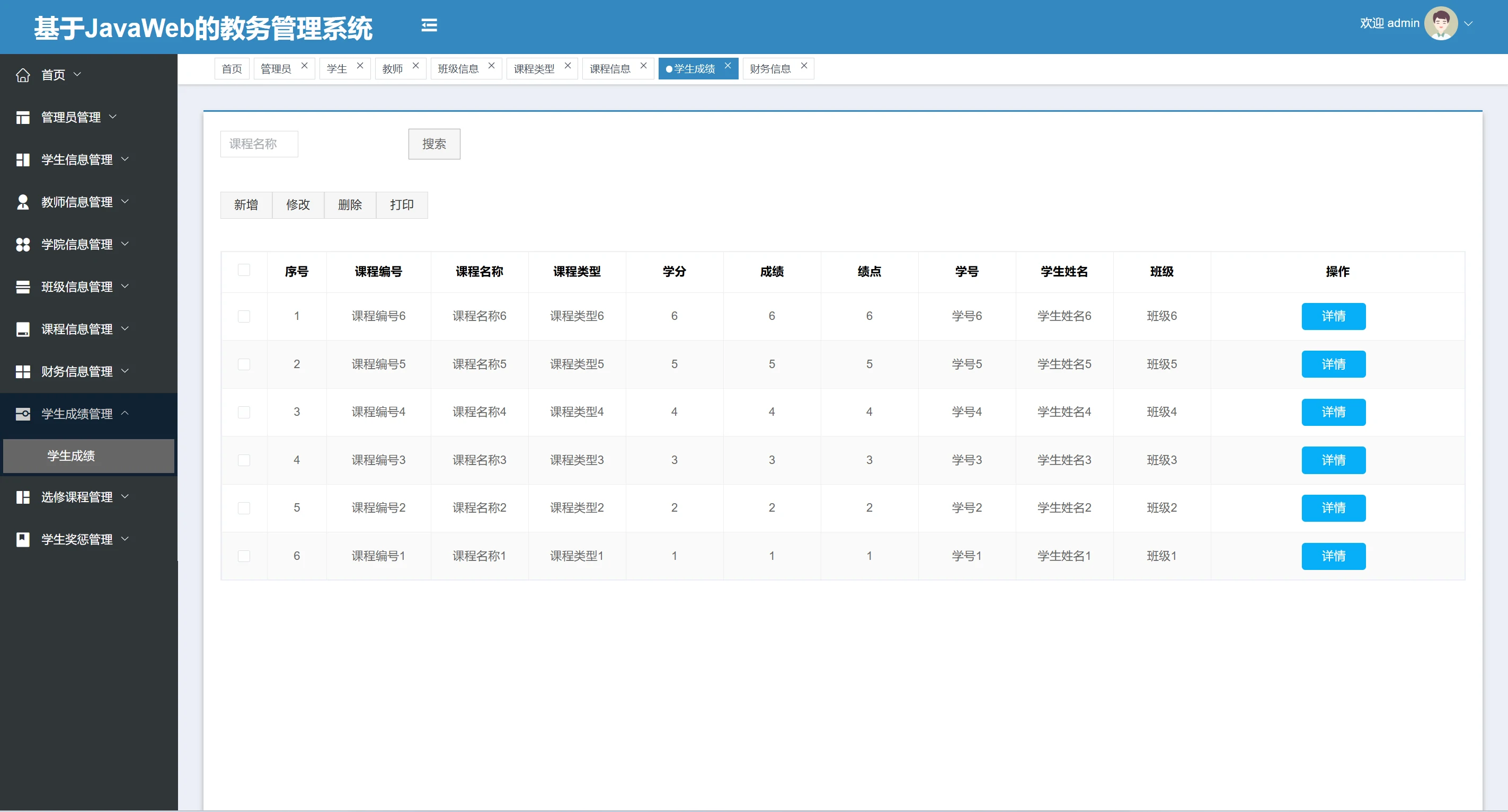 此教务管理系统基于SpringBoot框架开发,数据库mysql,前端使用Vue。拥有学生、老师、学校用户角色,并且前后台分离项目,拥有管理员管理、学生信息管理、学院信息管理、班级信息管理、课程信息管理、财务信息管理、学生成绩管理、选修课程管理、学生奖惩管理。