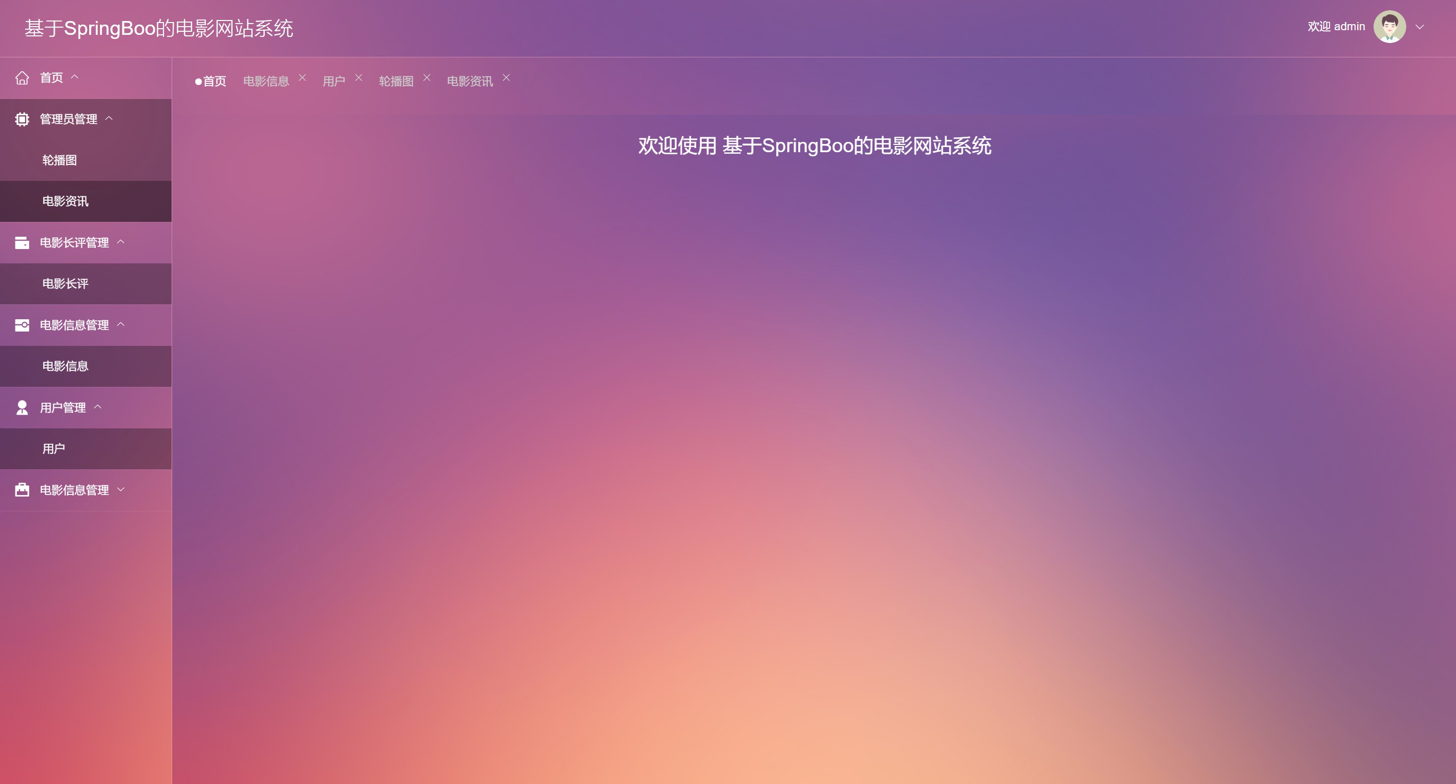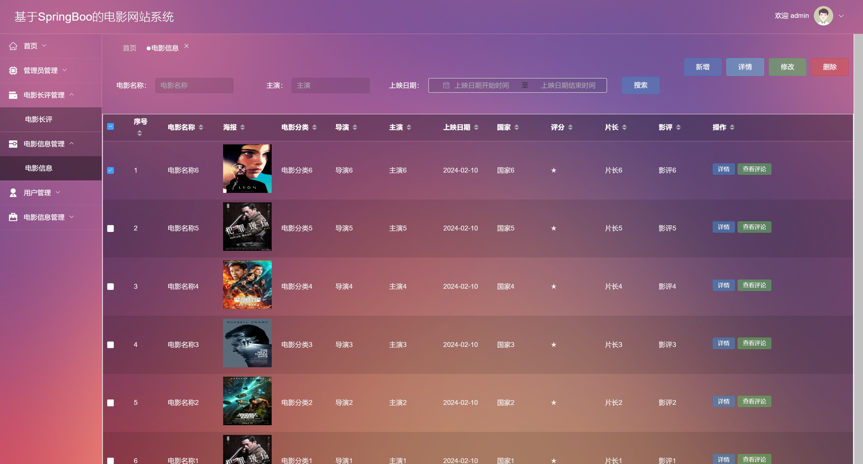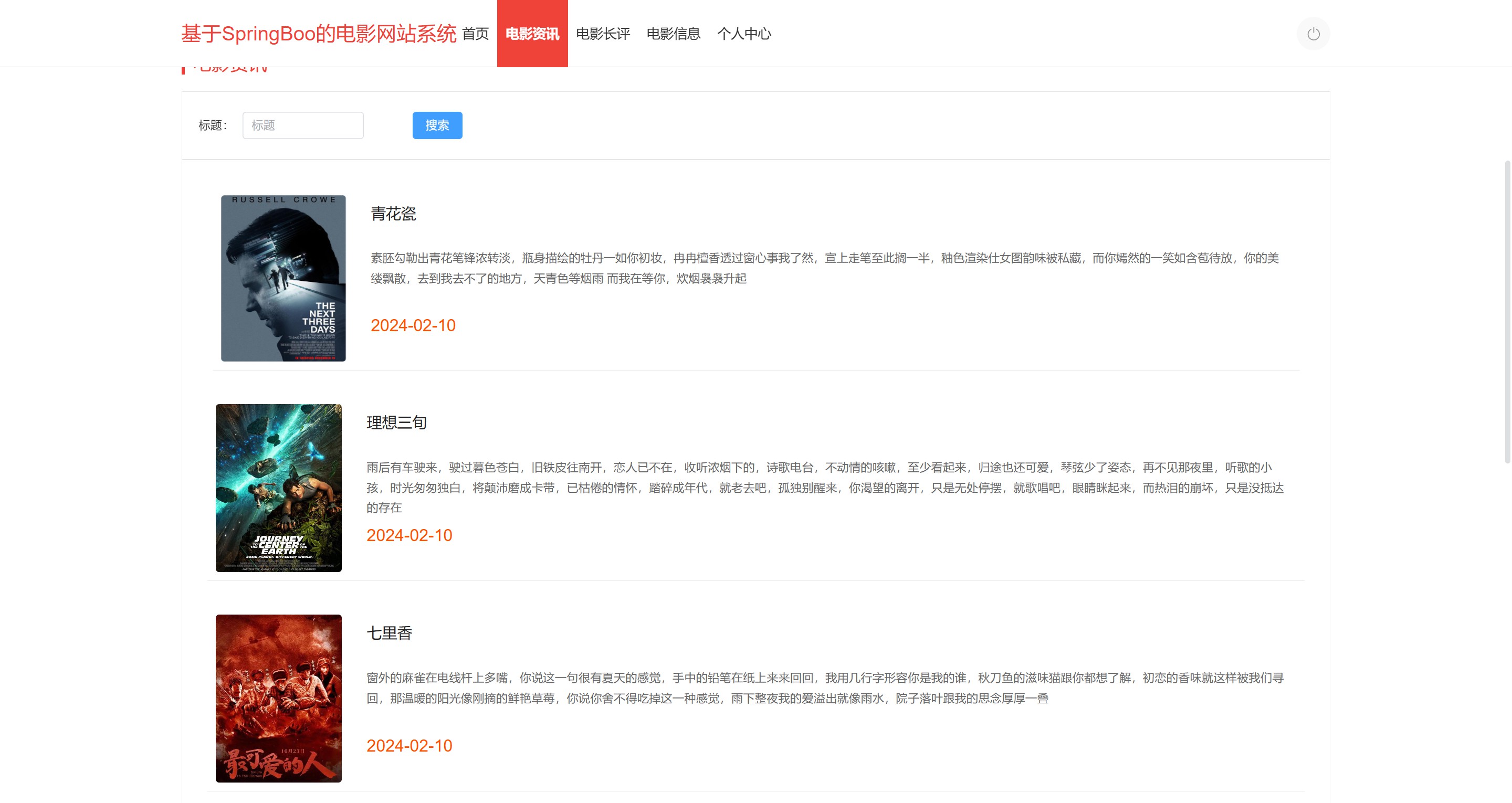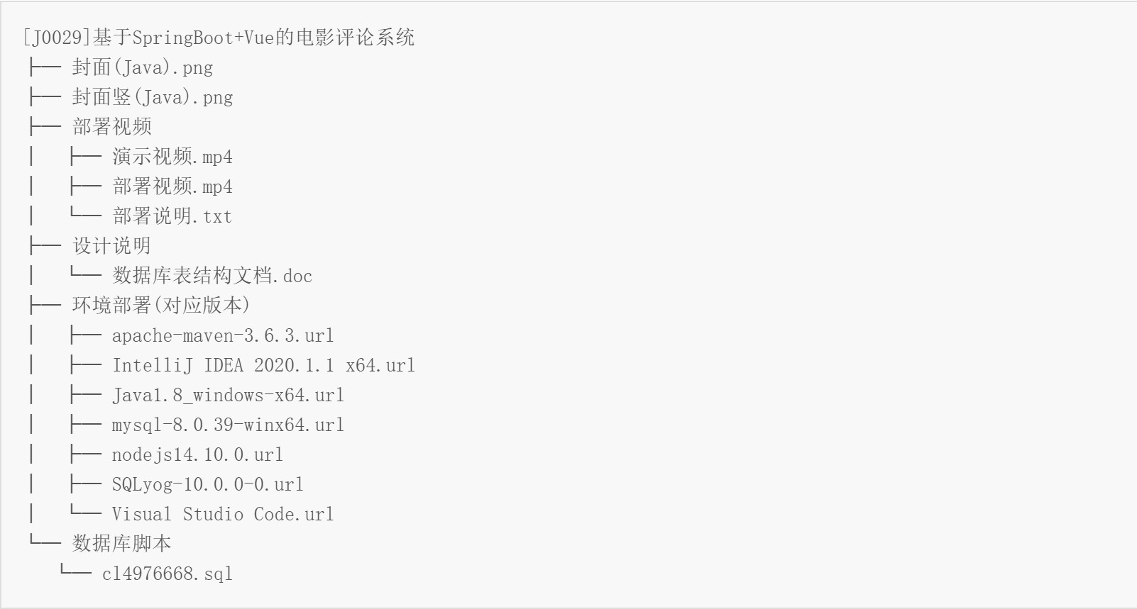 此电影评论系统基于SpringBoot框架开发,数据库mysql,前端使用Vue。拥有用户、管理员角色,并且前后台分离项目,拥有系统管理、电影长评、电影信息、用户管理。