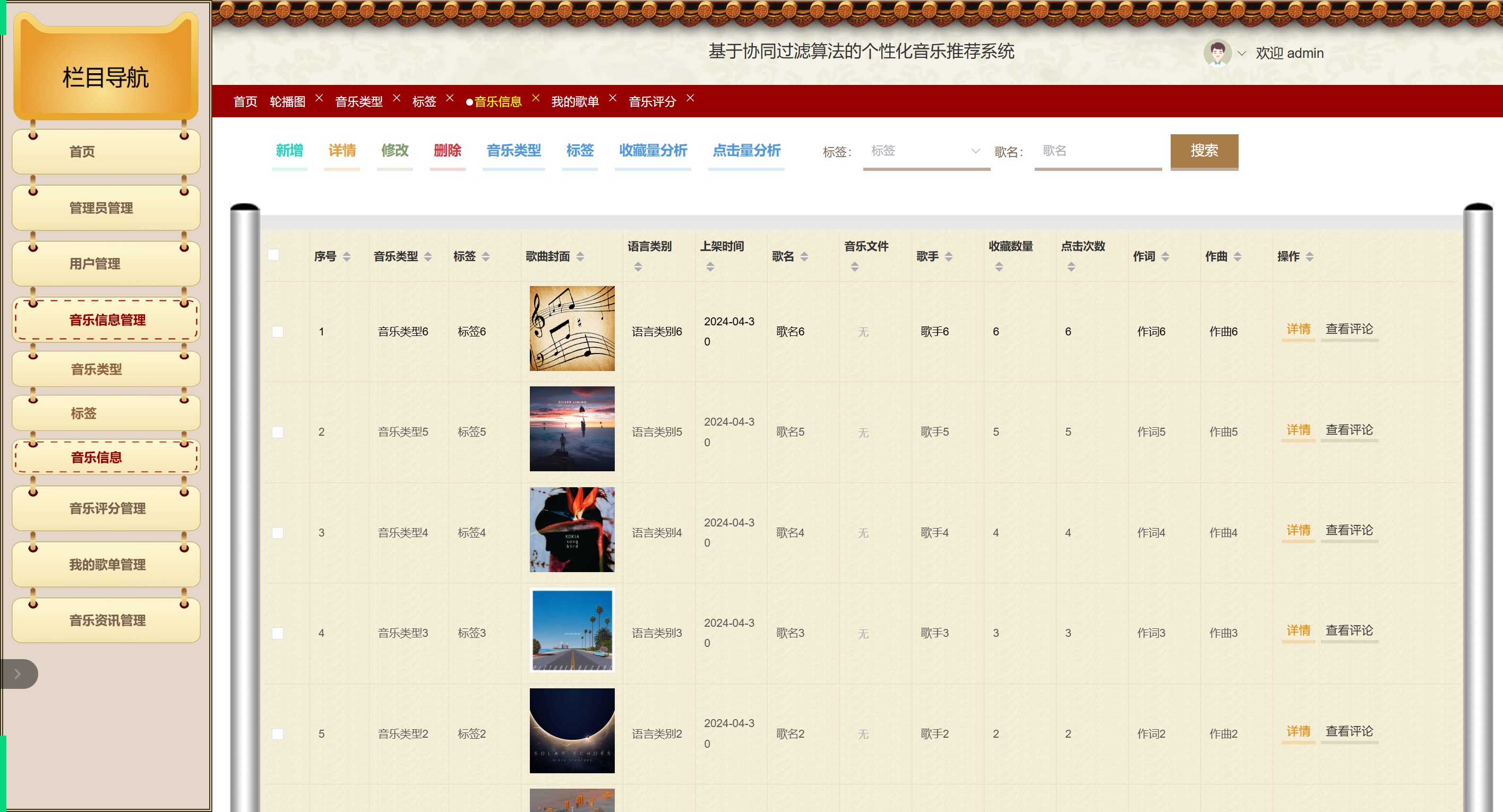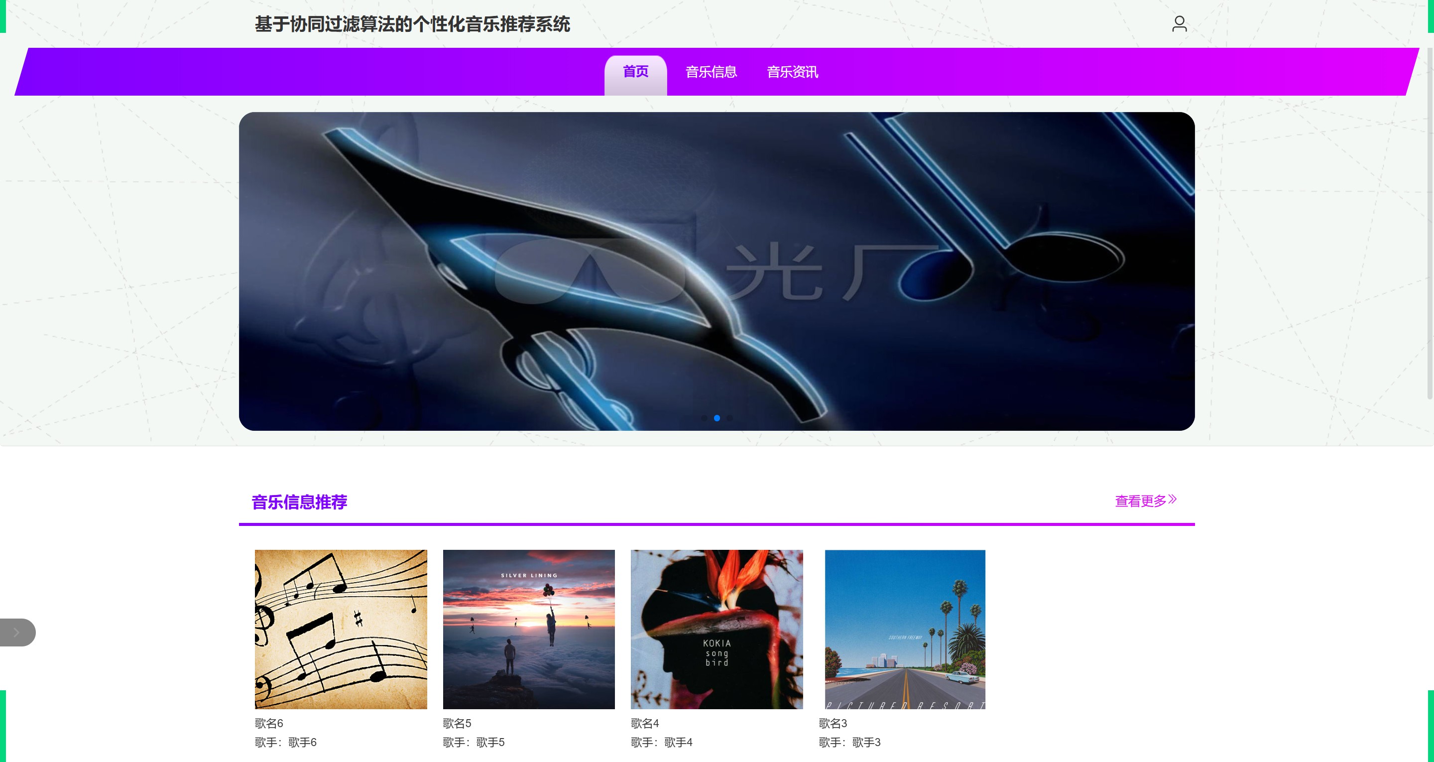 此音乐推荐系统基于SpringBoot框架开发,数据库mysql,前端使用Vue。拥有用户、管理员角色,并且前后台分离项目,拥有系统管理、音乐信息管理、音乐评分信息、我的歌单管理、音乐资讯管理。