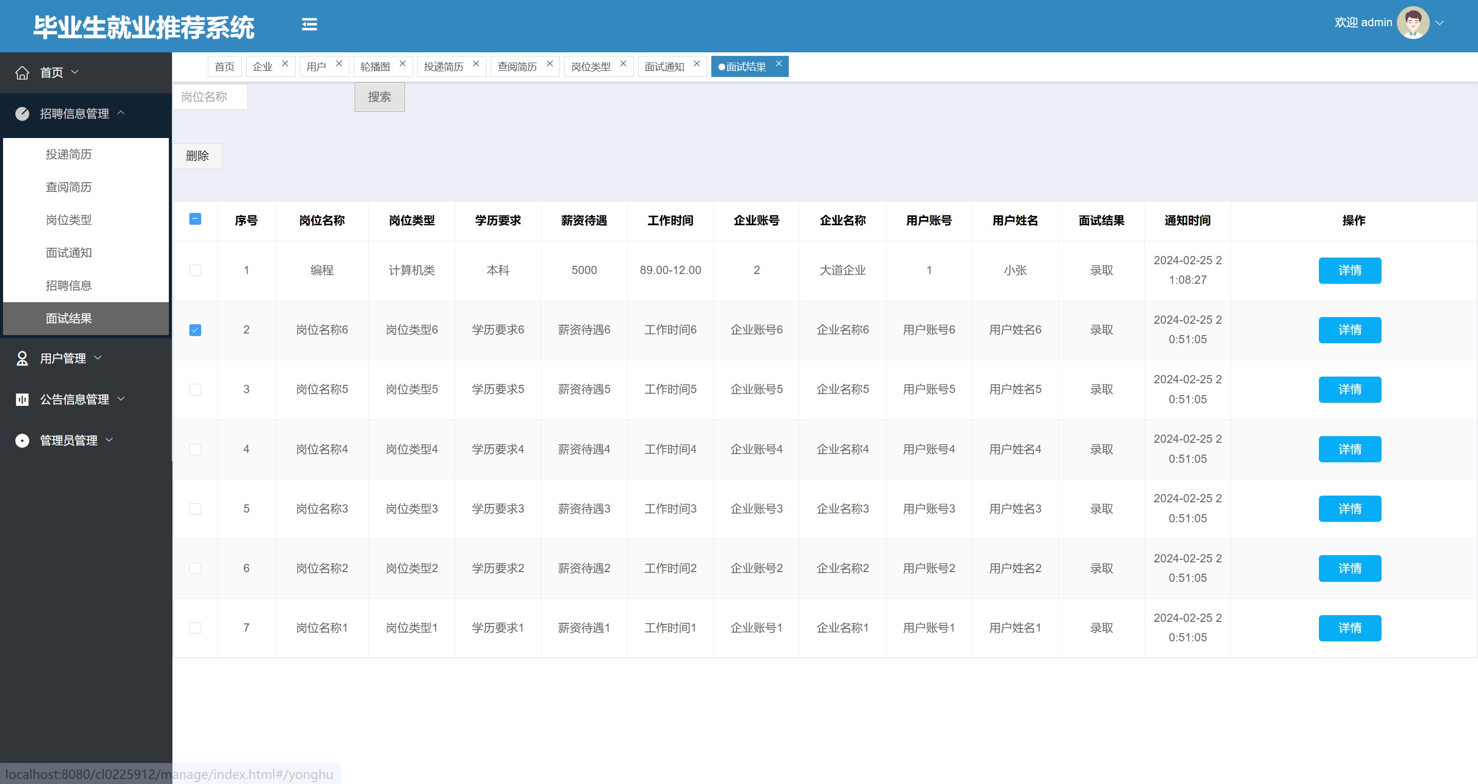 此毕业生就业推荐系统基于SpringBoot框架开发,数据库mysql,前端使用Vue。拥有用户、管理员角色,并且前后台分离项目,拥有招聘信息管理、用户管理、公告信息管理、管理员管理。