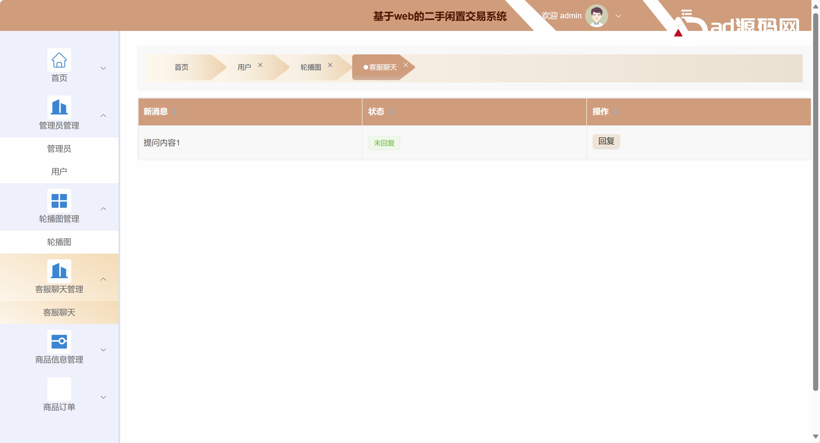 此二手闲置交易系统基于SpringBoot框架开发,数据库mysql,前端使用Vue,前后台分离项目,拥有管理员管理,用户管理,客服聊天管理,商品信息管理,商品订单。