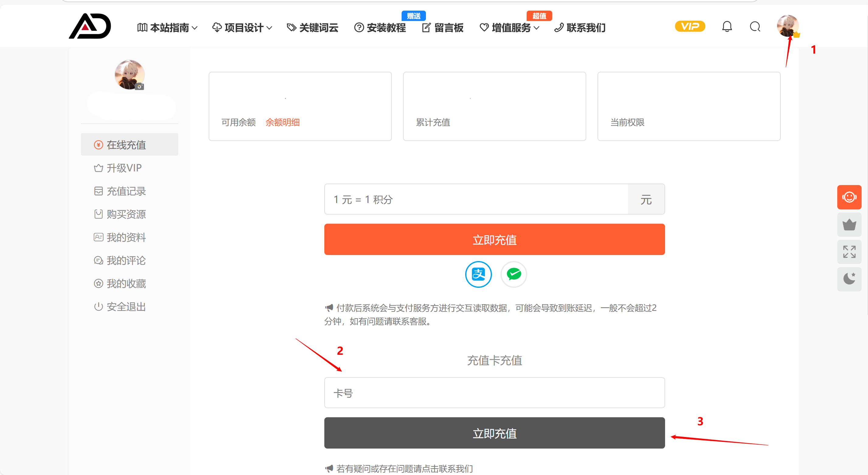 注册登录 => 点击头像进入个人中心 =>找到充值卡充值 => 输入充值卡=> 点击充值